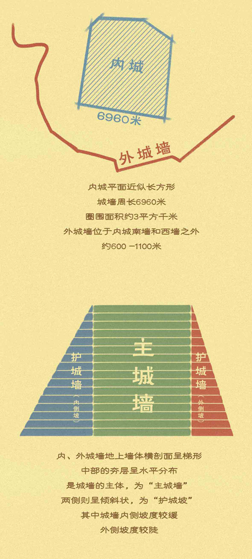 “鄭州商城遺址近似長(zhǎng)方形,面積有二十五平方公里。城垣高大,北城墻長(zhǎng)約1690米,西墻長(zhǎng)約1870米,南墻和東墻長(zhǎng)度均為1700米,周長(zhǎng)近7公里。城墻底寬20米左右,頂寬5米多,其高度復(fù)原后約10米。”